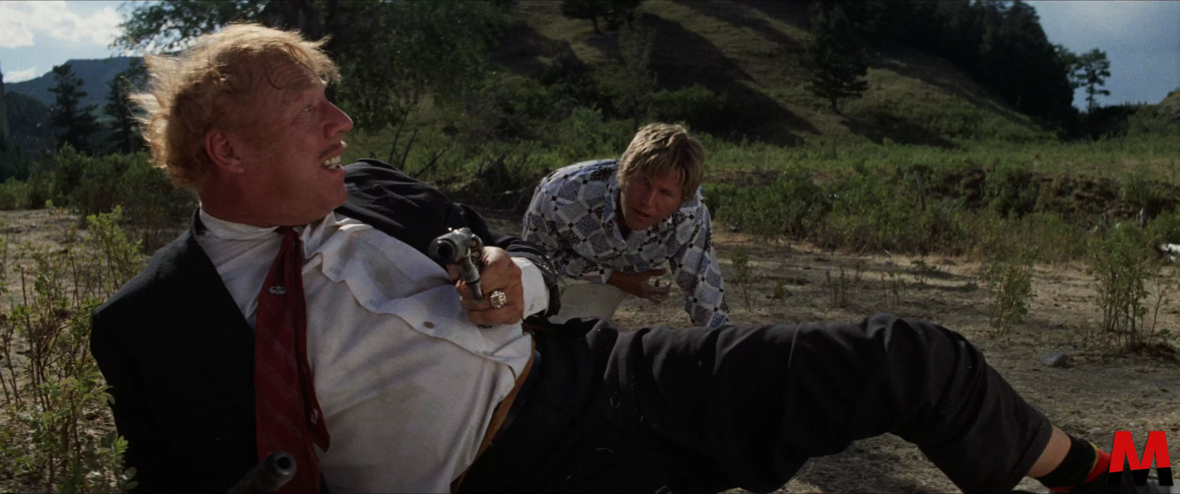 Und ja, Eastwood hat sichtlich Mühe, gegen den komplett entfesselten Jeff Bridges anzuspielen, der einen deutlich effektiveren Ruhepol gut hätte brauchen können. So kann es bisweilen ein wenig anstrengend für den Zuschauer werden. Ganz fantastisch dagegen George Kennedy und Geoffrey Lewis als völlig konträre Gangster. Gerade ersterer spielt zum blutigen Showdown nochmal grandios auf und verleiht seiner Rolle etwas derart bedrohliches wie verabscheuungswürdiges, dass man fast vergisst, wer den sympathisch-blöden Captain in Die Nackte Kanone gespielt hat. Tja. Schauspiel. Wahnsinn. Es gibt also einiges, was für den Film spricht. Der funktioniert auf mehreren Ebenen, nicht nur als Kumpelfilm, sondern eben auch als Heistmovie, Actioner und Roadmovie – nur überragt er eben in keinem dieser Aspekte. Wer sich an der bunten Platte nicht stört und ein Paradebeispiel für den amerikanischen Film der Siebziger sucht, kann mit gutem Gewissen einen Blick riskieren.