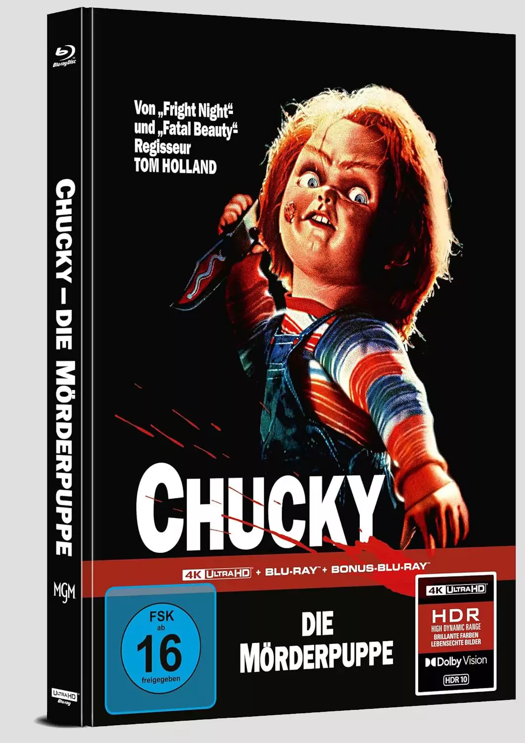 Chucky – Die Mörderpuppe erscheint in insgesamt drei sammlertauglichen Editionen, die allesamt zum gleichen Preis erhältlich sind, teils jedoch nur exklusiv im hauseigenen Shop des Labels vertrieben werden. Zum einen gibt es ein Mediabook mit zwei verschiedenen Motiven, denen neben der 4K UHD und Blu-Ray Remastered noch ein dritter Silberling mit umfangreichem Bonusmaterial beiliegt. Dazu gesellt sich ein 48-Seiten starkes Booklet mit einem informativen Begleittext von Marc Toullec in deutscher Übersetzung. Und dann ist da noch ein ebenso hochwertig verarbeitetes Steelbook, welches jedoch ohne besagte Büchlein auskommen muss.