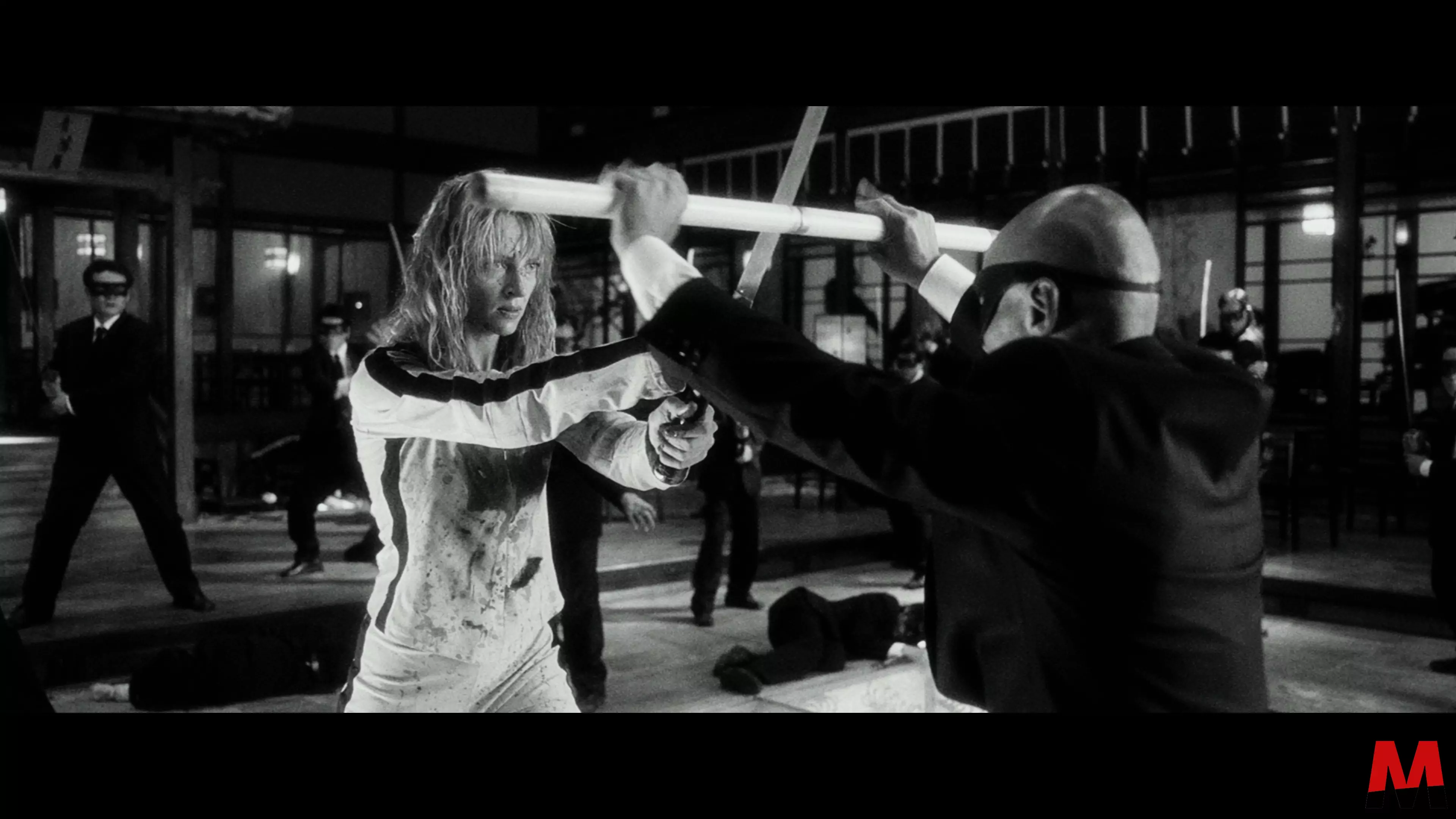 Obwohl digitale Produktionsprozesse zu Beginn des Millenniums noch in den Kinderschuhen steckten, wurde der vollständig auf 35mm-Analogmaterial hergestellte Film als Digital Intermediate gefinished – und zwar in 2K. Auf deren Basis wurden später auch die entsprechenden Heimkinoveröffentlichungen erstellt, wobei HD-DVD und Blu-Ray natürlich noch einige Jahre auf sich warten ließen – und wir mittlerweile natürlich wissen, welches der beiden Formate das Rennen gemacht hat. Zieht man die bestehende und über die Jahre immer wieder unverändert neu aufgelegte Blu-Ray nun erneut heran, hinterlässt die keinesfalls einen guten Eindruck. Nicht aufgrund schlechter Detailwiedergabe, die gemessen am Alter der Herstellung überwiegend tatsächlich okay ist, sondern aufgrund massiver Probleme bei Helligkeit und Farbsättigung. Schon während der in Schwarz-Weiß gehaltenen Eröffnungsszene fällt auf, wie krass das Gesicht von Uma Thurman überstrahlt.