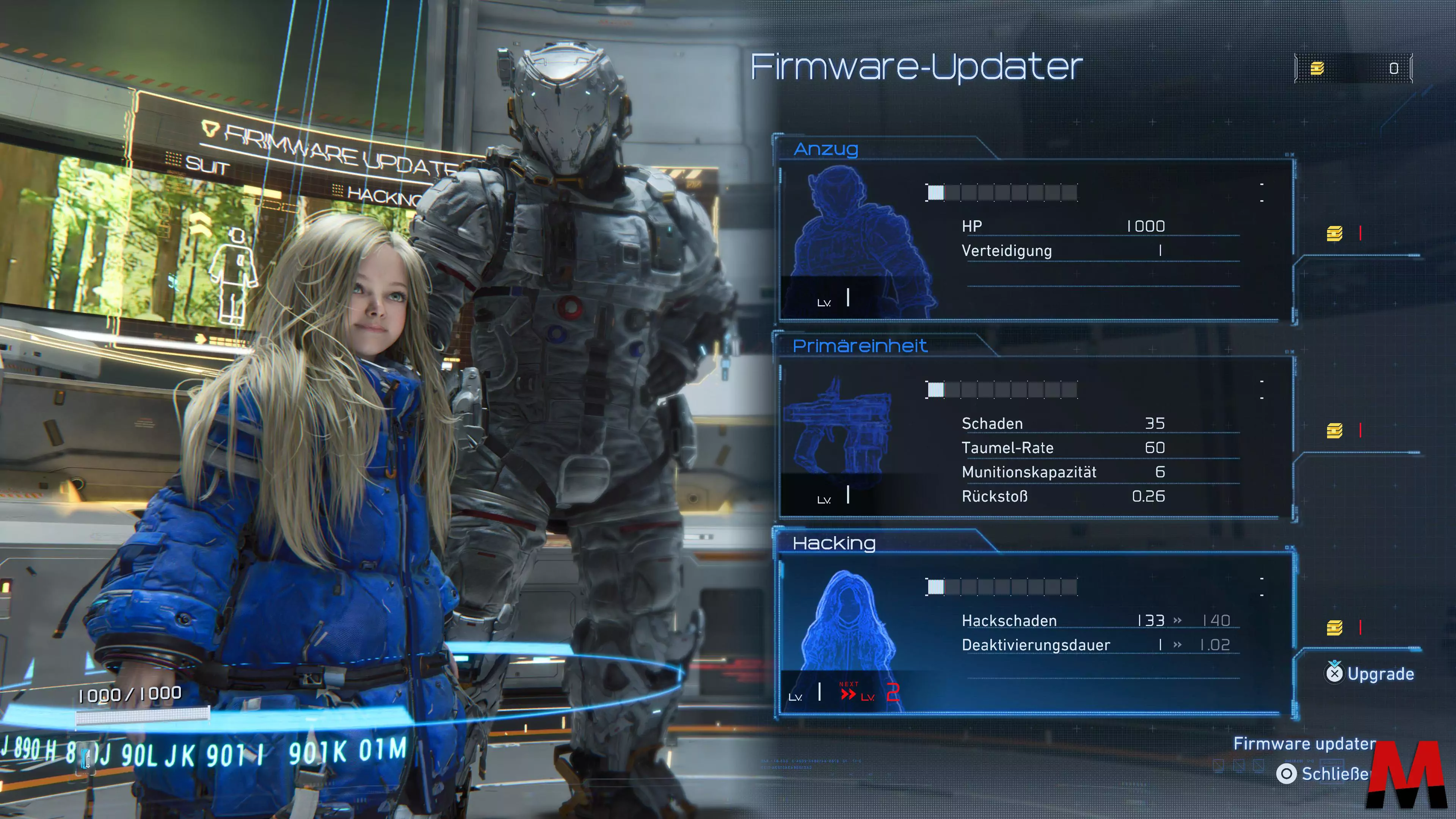 Das zwingt euch dazu, euren Spielstil immer wieder an die kommenden Herausforderungen (oder schlicht die individuelle Präferenz) anzupassen. Maximieren wir unsere Feuerkraft, oder doch lieber das Schadenspotenzial unserer Hacks? Verstärken wir erst unser offensives, oder unser defensives Arsenal? Ihr habt es in der Hand. Mir hat es jedenfalls großen Spaß gemacht, mit den einzigartigen Effekten des breit gefächerten Angebots zu experimentieren und mir schon mal Strategien für den zweiten Durchgang zurechtzulegen. Großer Grind ist dabei übrigens nicht erforderlich. Wer regelmäßig die Augen nach Ressourcenkisten und Co. Ausschau hält und nicht an jedem Gegner vorbeirennt, hat am Ende problemlos genügend Materialien auf Lager, um beinahe das gesamte Arsenal bis zum Maximum auszubauen.