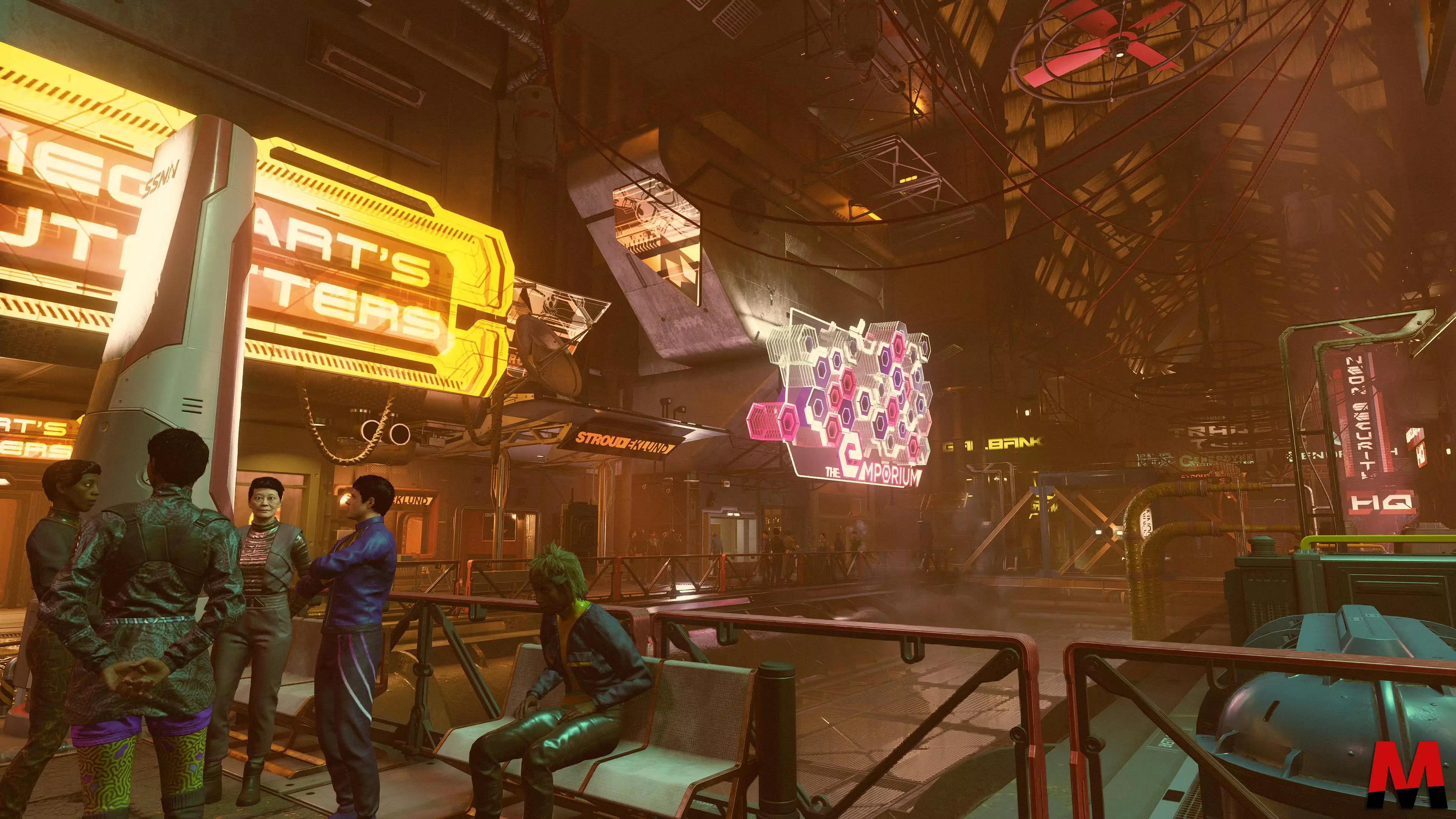 Wenn ich dem Spiel eine wirklich herausragende Eigenschaft attestieren müsste, wäre das wohl sein Design, welches man am ehesten als eine Art futuristischen Retrolook betiteln könnte – in Fachkreisen nennt man sowas ein Oxymoron. Bei der Gestaltung haben sich die Macher sehr vom Look der NASA-Technik aus den Sechzigern inspirieren lassen, der realistische Bezug fügt sich perfekt ins Setting ein und erinnert sehr angenehm an Klassiker wie Alien. Auf gewisse Weise modern, gleichzeitig durch langen Gebrauch ordentlich in Mitleidenschaft gezogen. Während Städte wie Neu Atlantis so sauber rüberkommen wie die Prequels von Star Wars, hat man bei Akila City das Gefühl, durch eine Stadt zu wandern, die in ihrer Art irgendwo zwischen dem Wilden Westen und einer Müllhalde ansiedelt. Und Neon erinnert sehr an die Kulissen von Blade Runner. Diese handgebauten Städte strotzen nur so voller Details, an jeder Ecke gibt es etwas zu entdecken. Man merkt sehr gut, wo in Starfield ausschließlich prozedural generierte Inhalte dargestellt werden und wo man wirklich per Hand gearbeitet hat. Wenn letzteres nur häufiger der Fall wäre…aber immerhin: Auch die Schiffe und deren Interieur sehen klasse aus, gleiches gilt für einen Großteil der Innenräume samt Einrichtung.