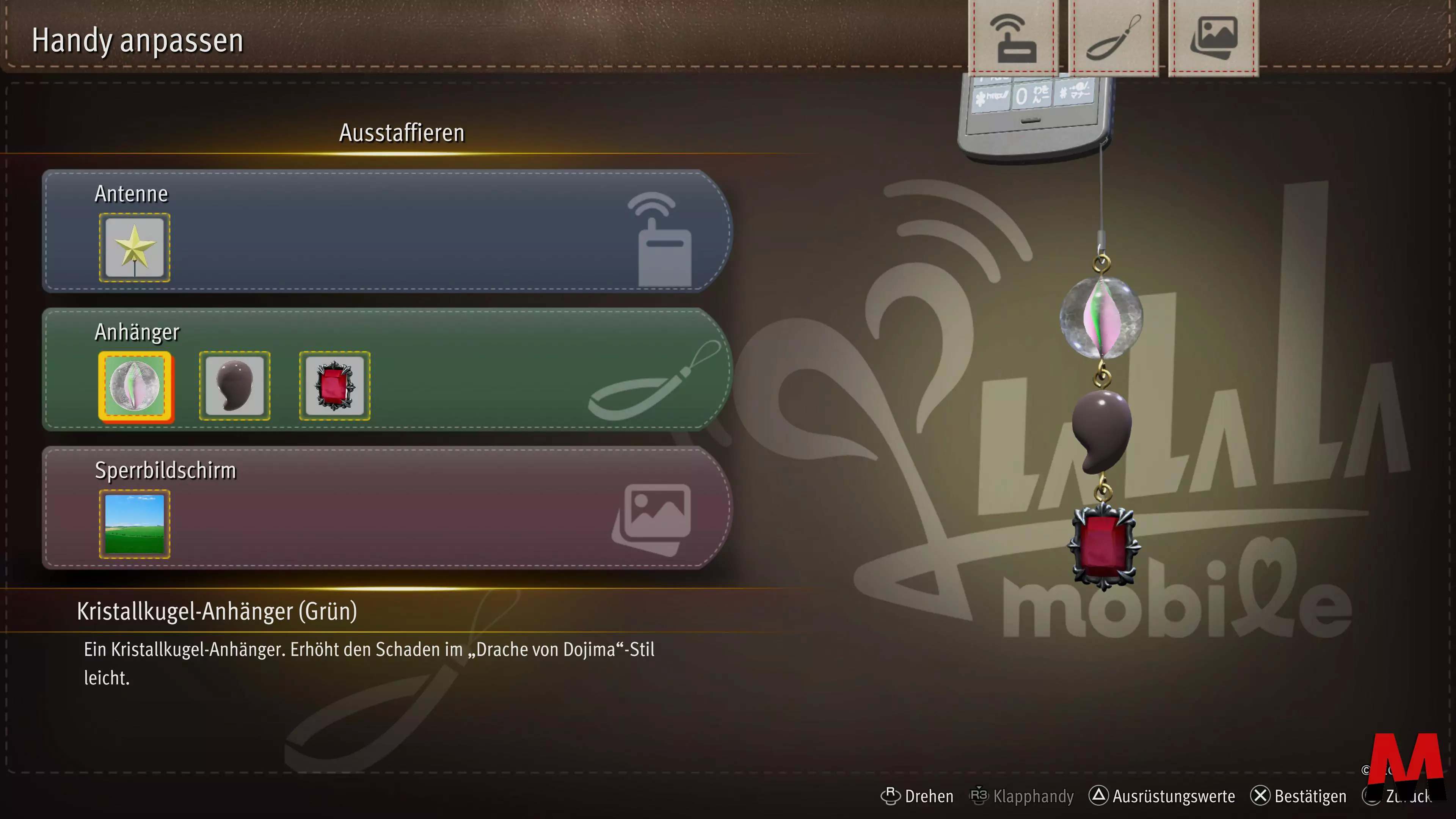 Das alles kann man praktisch nebenbei erledigen, gleiches gilt für das Aufspüren und Einsammeln der überall in den Städten versteckten Liebesboxen, die mit zusätzlichen Extras winken und nach einer Weile automatisch neu befüllt werden. Das lohnt sich jedoch höchstens in den ersten Stunden, da die darin enthaltenen Belohnungen später abseits kleinerer Finanzspritzen kaum noch richtig nützlich sind. In vielen Stores lassen sich außerdem neue Verzierungen und Anhänger erwerben, mit denen ihr Kiryu bis zu drei zusätzliche Perks verleihen könnt, die wie bereits erwähnt das bisherige Ausrüstungssystem ersetzen. Baka Mitai als Klingelton? Ich bin begeistert! Und für das Aufspüren der abtrünnigen Yakuza muss man nun nicht mehr jedes Mal umständlich ins Hauptquartier reisen, stattdessen spürt ihr die Ex-Genossen bequem via App auf.